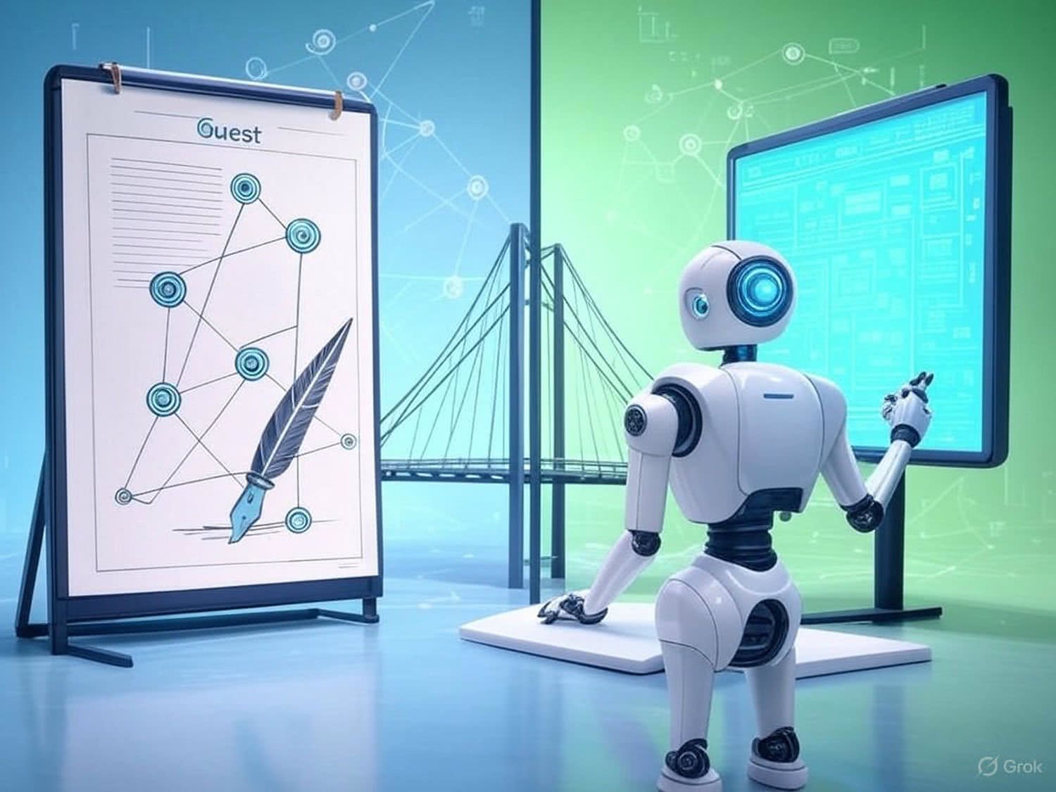 Stwórz ilustrację przedstawiającą ewolucję budowania linków w SEO: po jednej stronie tradycyjne metody jak guest posting z piórem i siecią linków, po drugiej stronie AI z robotem analizującym dane, połączone mostem symbolizującym integrację, w stylu nowoczesnym i profesjonalnym, z elementami sieci i algorytmów. Użyj kolorów niebieskiego i zielonego dla zaufania i wzrostu.