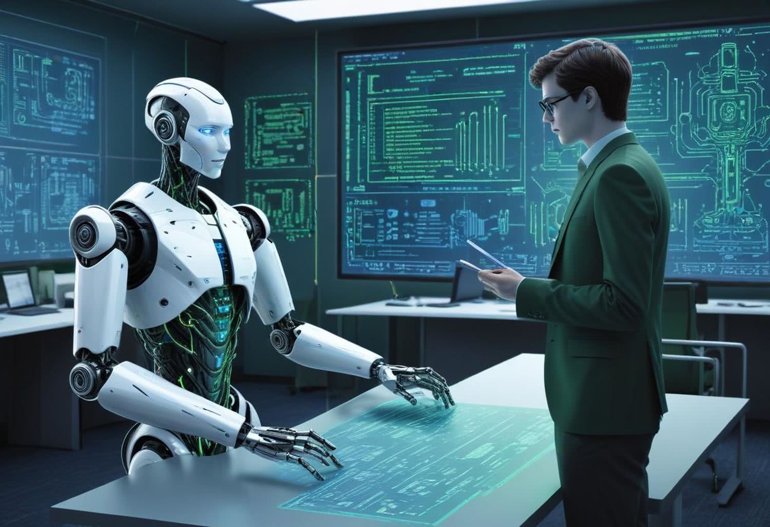 Stwórz ilustrację przedstawiającą równowagę między sztuczną inteligencją a ludzką kreatywnością w tworzeniu treści: po jednej stronie pokaż robota lub symbol AI generującego tekst na ekranie, po drugiej – człowieka edytującego ten tekst piórem lub klawiaturą, dodającego osobiste elementy; użyj nowoczesnego stylu z elementami cyfrowymi jak obwody i ikony treści, w kolorach niebieskim i zielonym, aby symbolizować technologię i autentyczność.
