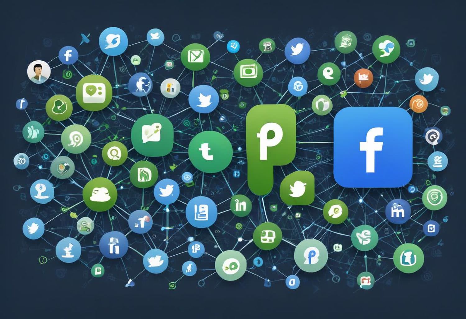 Stwórz ilustrację pokazującą integrację mediów społecznościowych z SEO: po lewej stronie ikony Facebooka, Twittera i LinkedIn wysyłające strumienie ruchu i linków, po prawej stronie wyszukiwarka Google z rankingami stron, z elementami takimi jak strzałki symbolizujące budowanie backlinków i zwiększanie zaangażowania użytkowników, w stylu nowoczesnej grafiki cyfrowej z dominującymi kolorami niebieskim i zielonym.