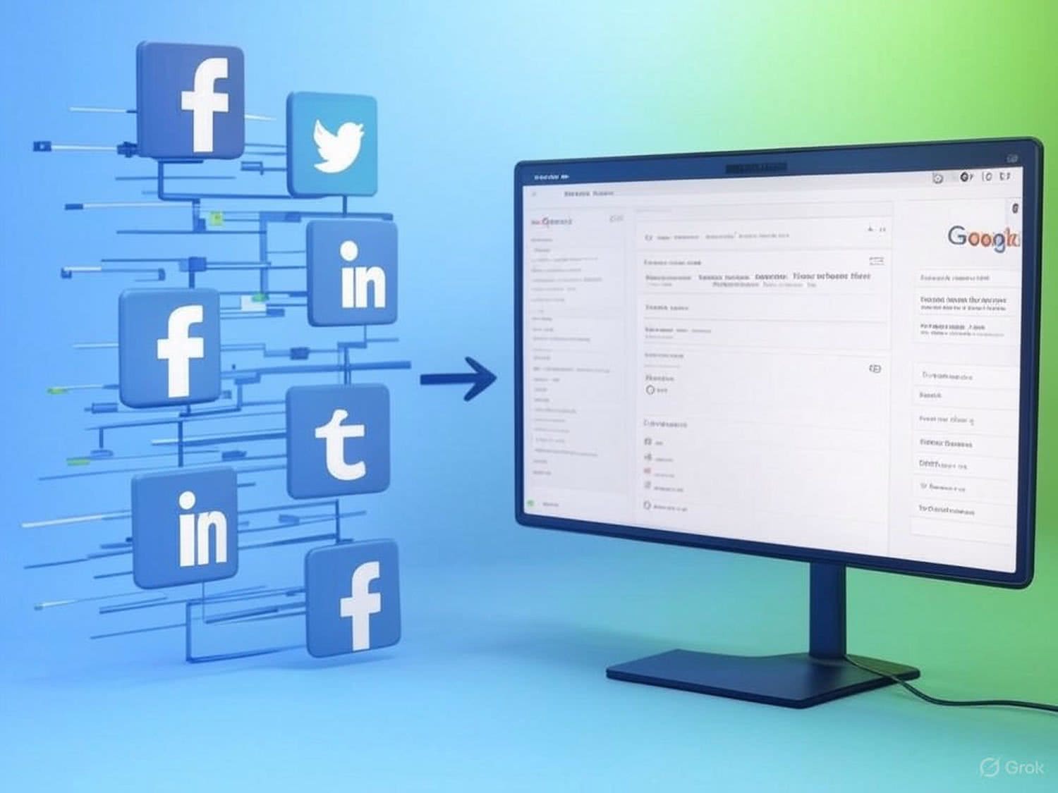 Semi-realistic illustration as a drawing: A high-resolution digital illustration of the integration of social media and SEO, featuring a clean, modern design with dominant blue and green colors. On the left side, the icons of Facebook, Twitter, and LinkedIn are prominently displayed, each emitting streams of data and links represented by digital lines. On the right side, the Google search engine interface is shown with visible search results and rankings. Arrows connect the social media icons to the search engine, symbolizing the building of backlinks and increased user engagement. The background is a subtle gradient from blue to green, enhancing the digital and technological theme without distracting from the main elements. The overall composition is focused and clear, emphasizing the relationship between social media and SEO in a visually engaging manner. IMAGE STYLE: Use a warm color palette of red, deep blue, deep purple, deep orange, light grays, and a touch of green, yellow. Draw outlines with black lines. The background should be blurred and minimalistic. The mood should be modern with a bit of vintage style.