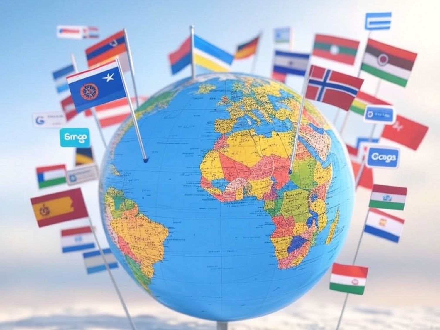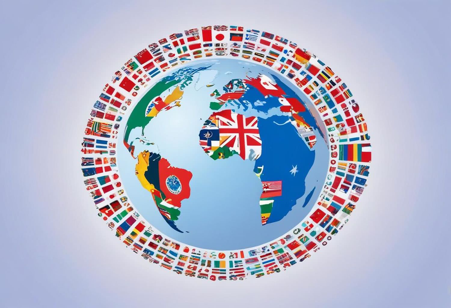 Stwórz ilustrację przedstawiającą globus Ziemi otoczony flagami różnych krajów, z nakładanymi ikonami wyszukiwarek, słowami kluczowymi w kilku językach (np. „buy shoes” i „schuhe kaufen”) oraz tagami HTML jak hreflang, symbolizując globalne SEO wielojęzyczne w stylu profesjonalnym i nowoczesnym. kolory żywe, z elementami kulturowymi w tle, takimi jak różnorodni ludzie na ekranie komputera.
