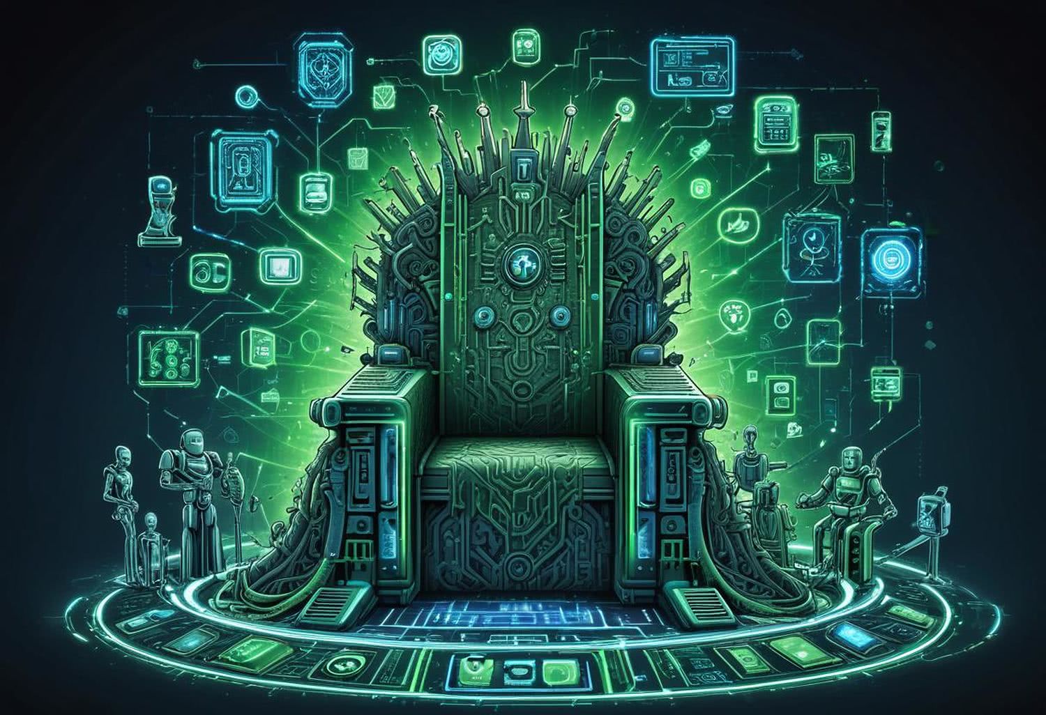 Stwórz ilustrację przedstawiającą tron symbolizujący techniczne SEO w 2025 roku, zbudowany z ikon szybkości ładowania, HTTPS, robotów indeksujących, elementów Web 3.0 jak blockchain, urządzeń mobilnych i algorytmów AI, w stylu nowoczesnym, cyfrowym i futurystycznym, z dominacją niebieskich i zielonych kolorów. Pokazuj dynamiczną stronę internetową w tle.