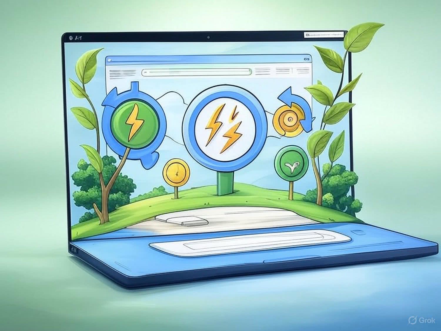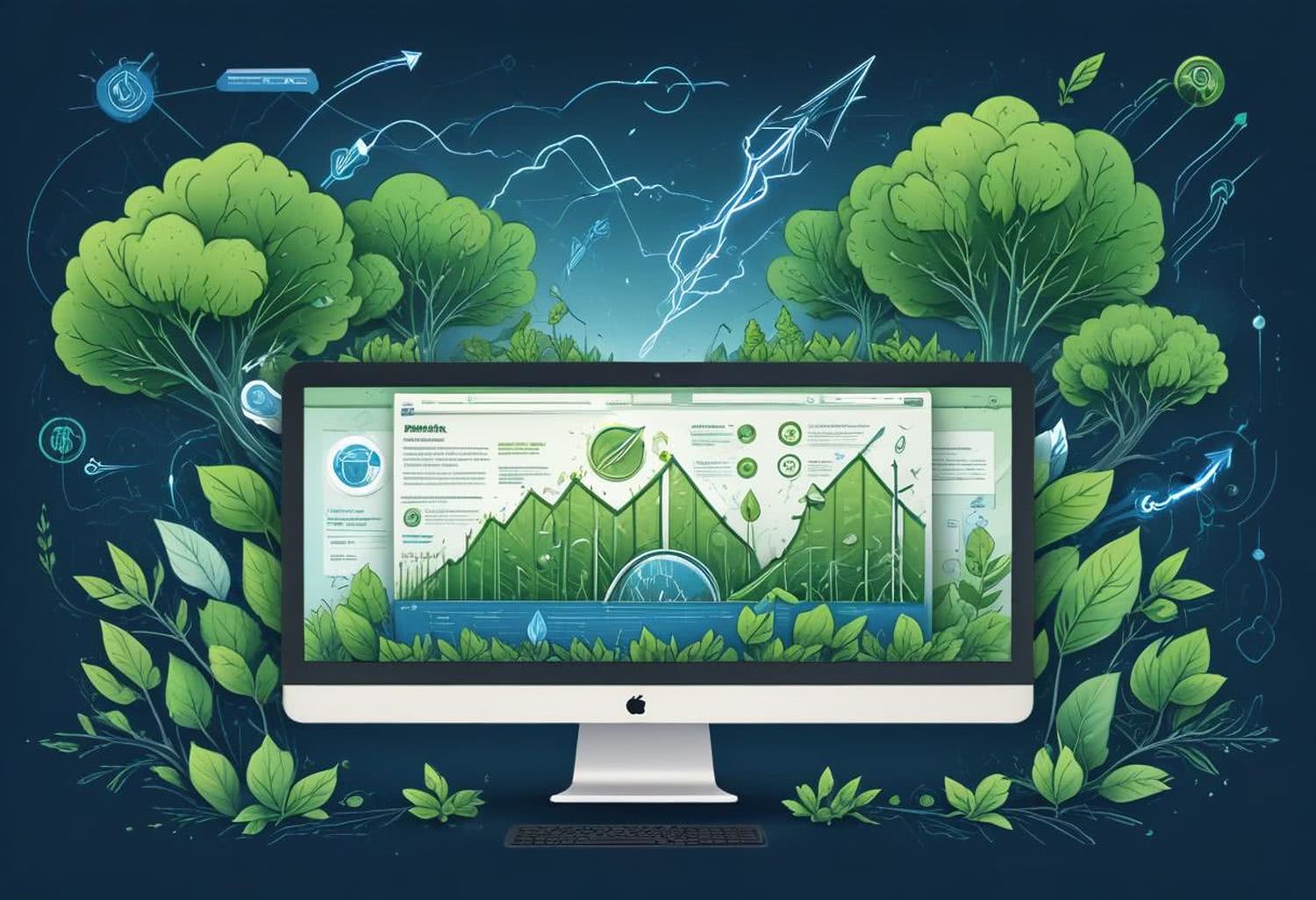 Semi-realistic illustration as a drawing: A high-resolution illustration of a modern, eco-friendly website homepage with a central layout featuring green and blue tones. The website prominently displays icons of SEO optimization including lightning bolts and arrows, symbolizing fast loading and data compression. Natural elements like leaves and trees are integrated around the central design, enhancing the theme of sustainability. The background subtly incorporates a soft gradient of green and blue, providing a calm and inviting atmosphere. The overall composition focuses on the central website design, ensuring clarity and visual harmony without distracting elements. IMAGE STYLE: Use a warm color palette of red, deep blue, deep purple, deep orange, light grays, and a touch of green, yellow. Draw outlines with black lines. The background should be blurred and minimalistic. The mood should be modern with a bit of vintage style.