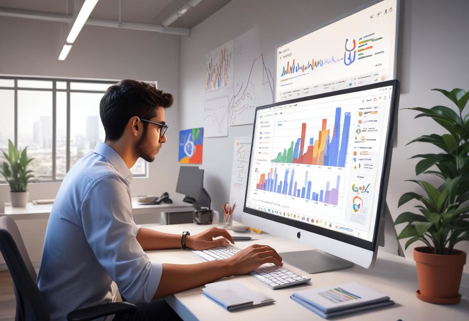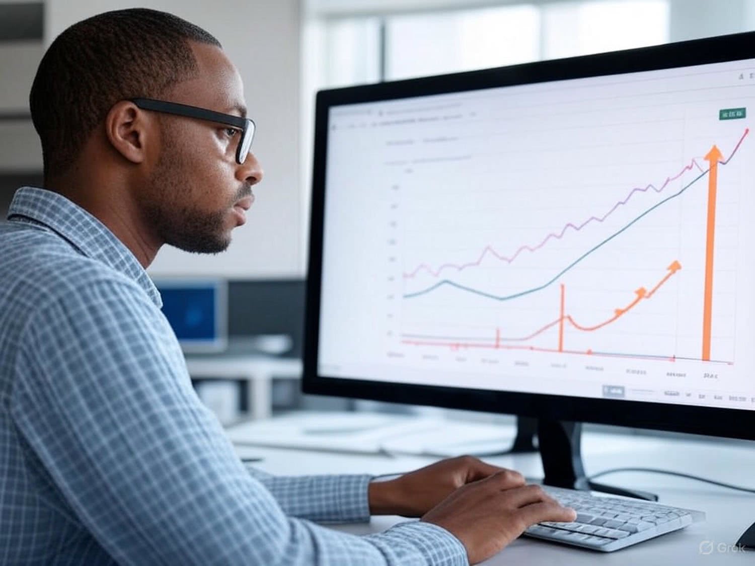 Semi-realistic illustration as a drawing: of a user in a modern office, focused on a computer screen displaying a Google search result with upward trending graphs. The user, with a focused expression, is centrally positioned with the screen prominently featured. In the background, stylized stairs represent Google’s ranking algorithm, lit to suggest a path to success. The office setting is clean and professional, with natural lighting and vibrant colors emphasizing the growth metrics. No unnecessary foreground elements or text are included, maintaining a clear and engaging composition centered on the user’s interaction with the search results. IMAGE STYLE: Use a warm color palette of red, deep blue, deep purple, deep orange, light grays, and a touch of green, yellow. Draw outlines with black lines. The background should be blurred and minimalistic. The mood should be modern with a bit of vintage style.