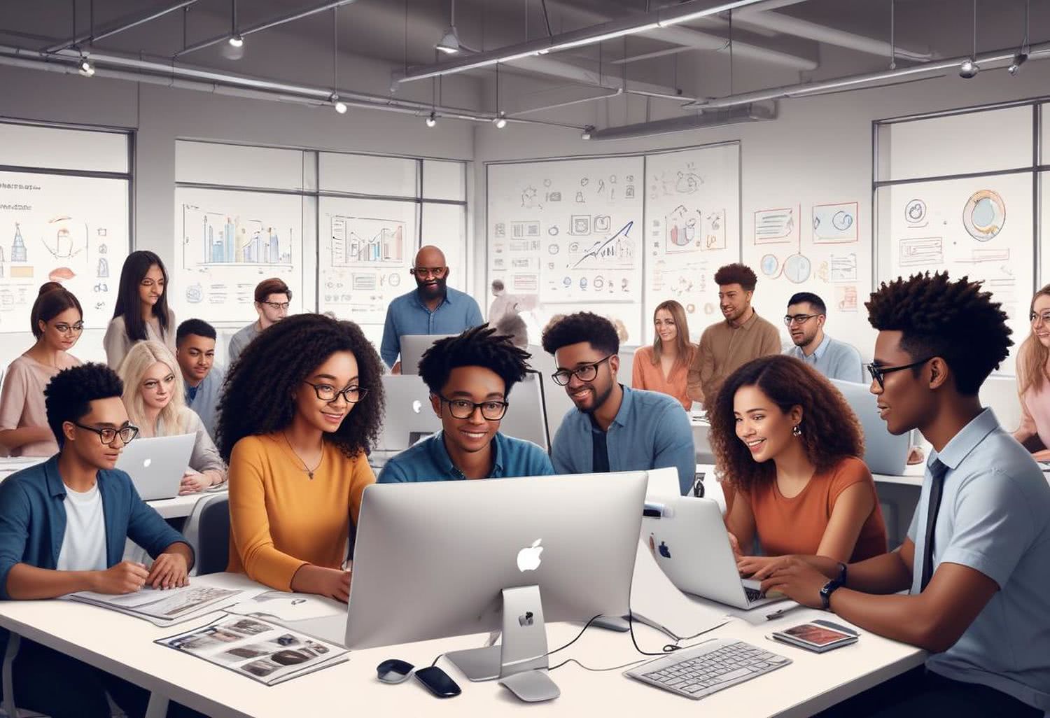 Semi-realistic illustration as a drawing: of a diverse group of people working collaboratively in a modern, well-lit office. The group, consisting of individuals of various ages and ethnicities, is focused on their computers, engaged in creating user-generated content such as comments, reviews, and photos. The background features subtle icons of social media platforms and upward arrows symbolizing SEO growth, without overwhelming the main subjects. The office setting includes natural light from large windows and modern decor, enhancing the vibrant and professional atmosphere. The composition centers on the group, with their faces clearly visible, emphasizing their teamwork and productivity. IMAGE STYLE: Use a warm color palette of red, deep blue, deep purple, deep orange, light grays, and a touch of green, yellow. Draw outlines with black lines. The background should be blurred and minimalistic. The mood should be modern with a bit of vintage style.