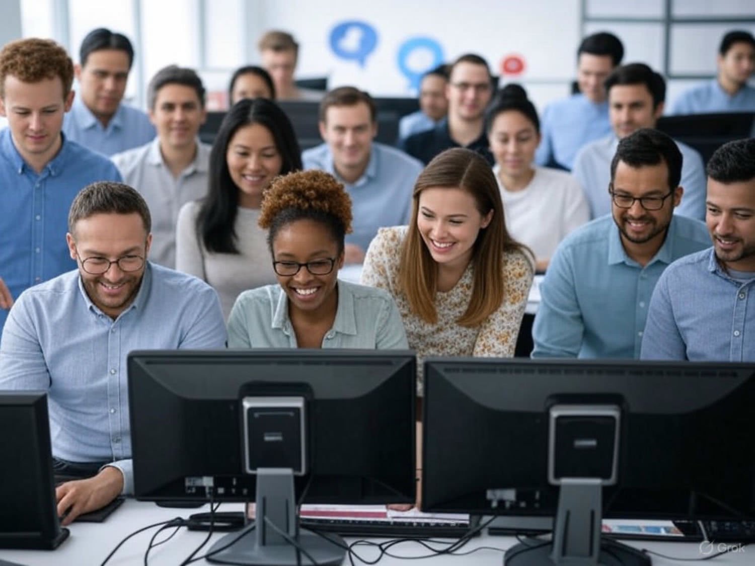 Generuj ilustrację: Pokazująca grupę różnorodnych osób przy komputerach, tworzących treści UGC takie jak komentarze, recenzje i zdjęcia, co prowadzi do wzrostu widoczności w wyszukiwarce Google – z elementami jak ikony mediów społecznościowych, strzałki w górę rankingów i symboli SEO, w stylu nowoczesnej infografiki z żywymi kolorami.