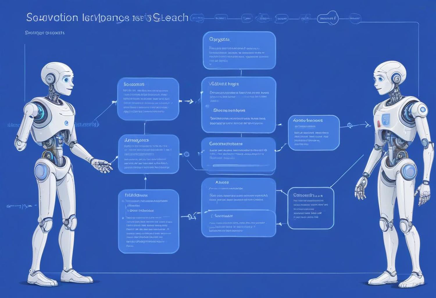 Semi-realistic illustration as a drawing: A high-resolution digital illustration of the evolution of search engines, featuring a classic Google search interface on the left with a list of results and search terms in blue, and a ChatGPT-like AI chatbot interacting with a user on the right, symbolizing conversational search. The background includes subtle elements like LLM algorithms and SEO icons, maintaining a modern and dynamic feel with dominant blue and green colors. The interface is sleek and uncluttered, focusing on the main subjects without distracting foreground elements or unnecessary text. IMAGE STYLE: Use a warm color palette of red, deep blue, deep purple, deep orange, light grays, and a touch of green, yellow. Draw outlines with black lines. The background should be blurred and minimalistic. The mood should be modern with a bit of vintage style.