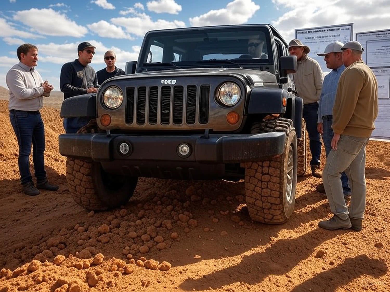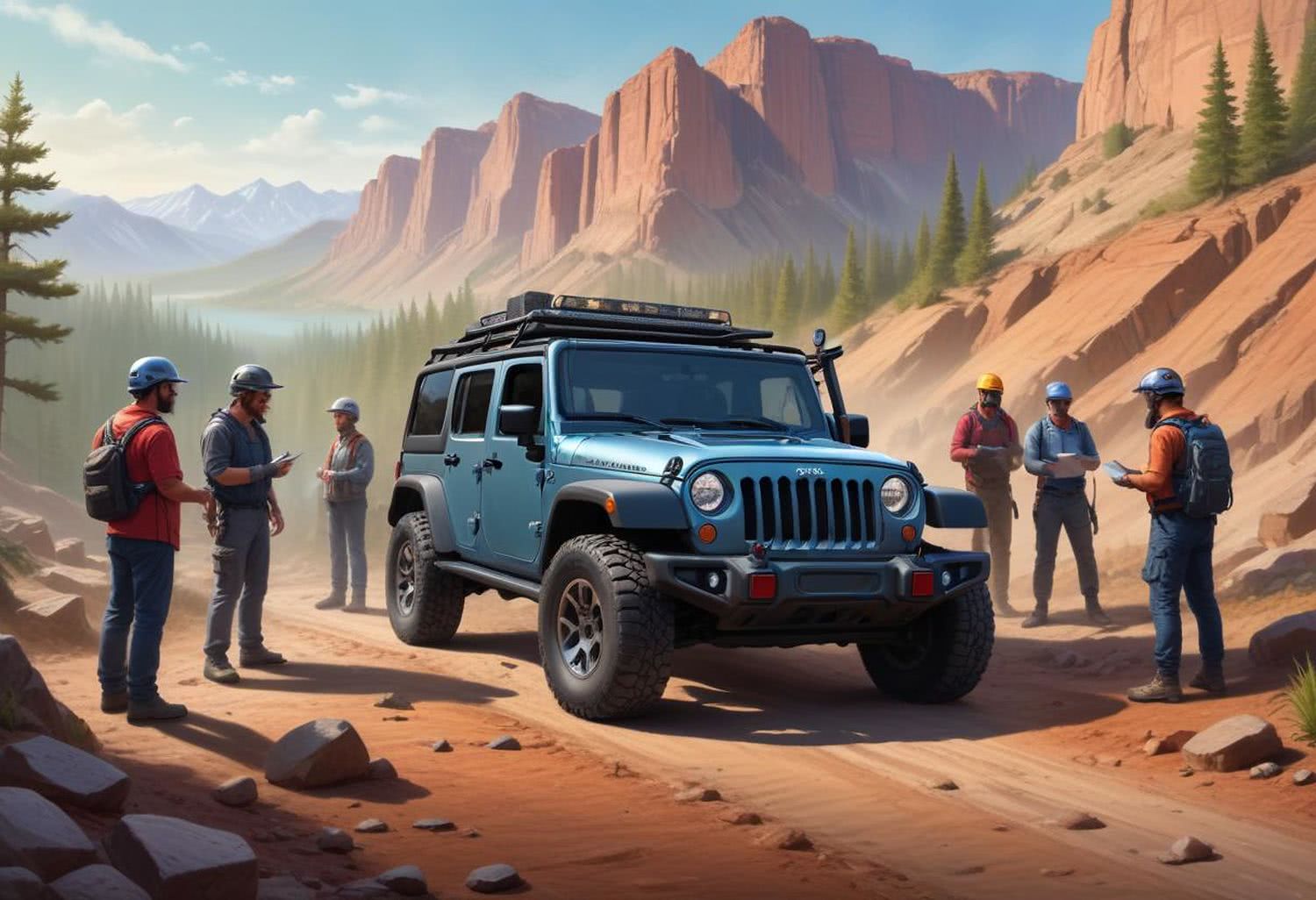 Ilustracja przedstawiająca profesjonalną wypożyczalnię aut terenowych: samochód terenowy, jak Jeep Wrangler, na skalistym szlaku off-road, z ekspertem w stroju ochronnym omawiającym szczegóły z grupą zadowolonych klientów, w tle widoczne certyfikaty bezpieczeństwa i elementy mediów społecznościowych, symbolizujące doświadczenie, ekspertyzę, autorytet i wiarygodność w branży off-road. Styl realistyczny, dynamiczny, z żywymi kolorami ziemi i nieba.