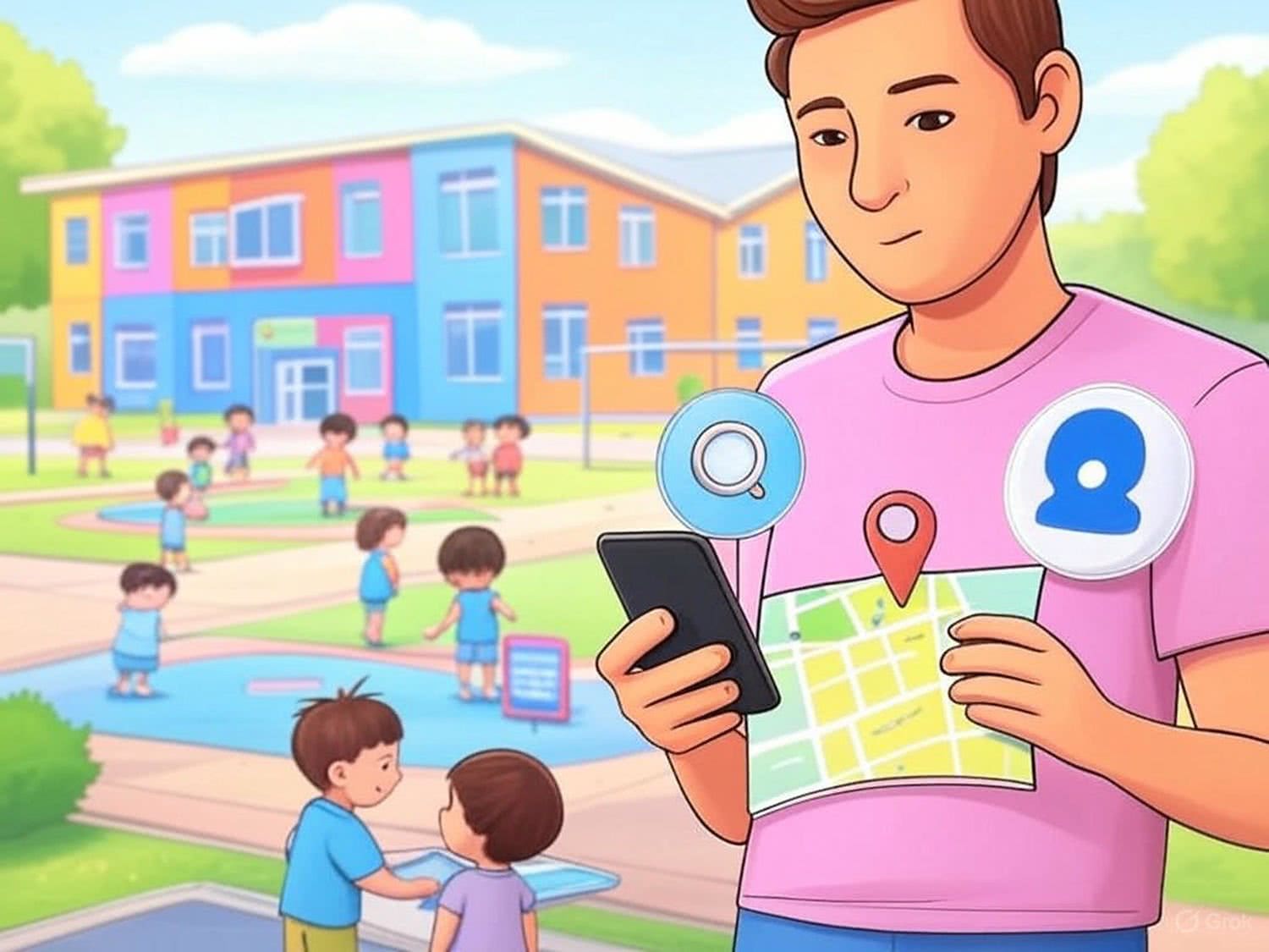 Stwórz ilustrację przedstawiającą rodzica z smartfonem w ręku, przeglądającego mapę z pinezką na przedszkolu, w tle budynek przedszkola z bawiącymi się dziećmi oraz ikony SEO jak słowa kluczowe i profil Google My Business, w stylu przyjaznym i kolorowym.