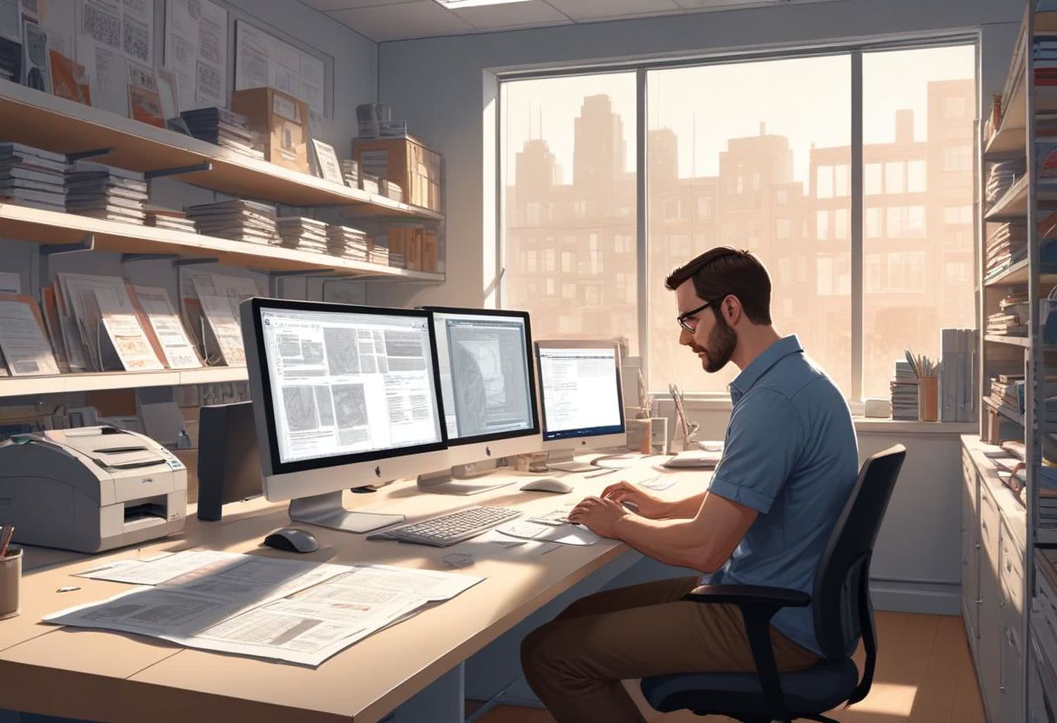 Semi-realistic illustration as a drawing: of a male worker in his mid-30s, dressed in casual office attire, sitting at a desk in a modern print shop. He is focused on a computer, writing a blog article about design. The background features visible printing machines and shelves with printing materials, all softly lit by natural light from a window to the side. Subtle SEO symbols like upward arrows and a magnifying glass icon are integrated into the environment. The scene uses vibrant colors to emphasize the connection between content marketing and the printing industry, maintaining a professional and contemporary atmosphere without unnecessary distractions. IMAGE STYLE: Use a warm color palette of red, deep blue, deep purple, deep orange, light grays, and a touch of green, yellow. Draw outlines with black lines. The background should be blurred and minimalistic. The mood should be modern with a bit of vintage style.