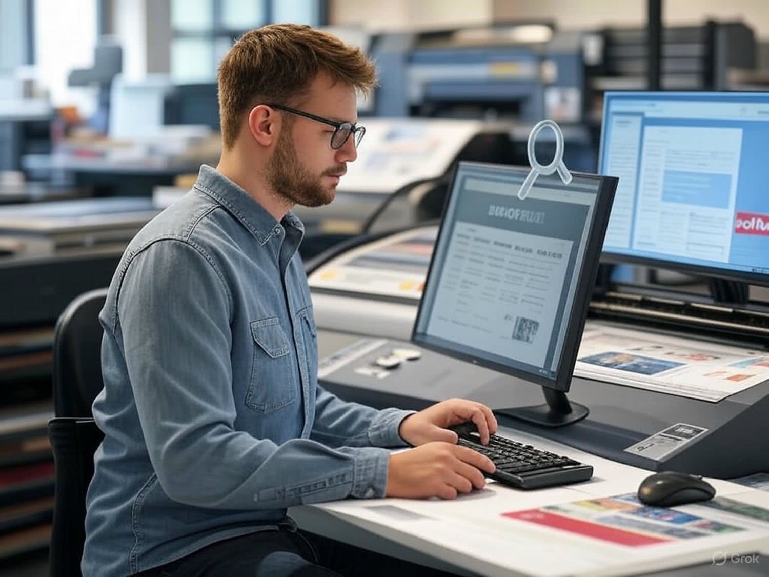 Stwórz ilustrację przedstawiającą pracownika drukarni przy komputerze, piszącego artykuł blogowy o projektowaniu materiałów reklamowych, z elementami maszyn drukarskich w tle, symbolami SEO jak strzałki w górę i ikoną wzrostu ruchu organicznego, w stylu nowoczesnym i profesjonalnym. Użyj żywych kolorów, aby podkreślić połączenie content marketingu z branżą poligraficzną.