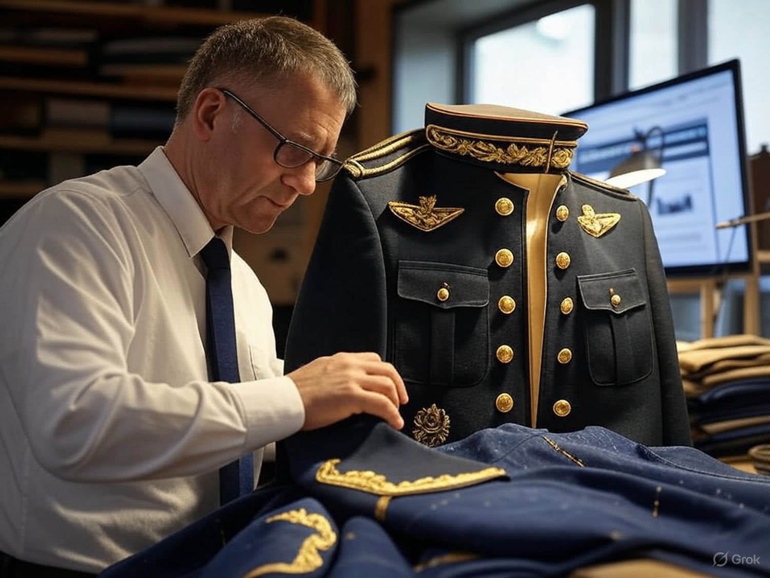 Generuj ilustrację przedstawiającą krawca w tradycyjnej pracowni, szyjącego elegancki mundur galowy z precyzyjnymi detalami jak hafty i guziki, z elementami content marketingu w tle: komputer z otwartym blogiem o historii mundurów, ikony filmów i social media, w stylu realistycznym z ciepłym oświetleniem warsztatu, aby podkreślić rzemiosło i angażowanie klientów.