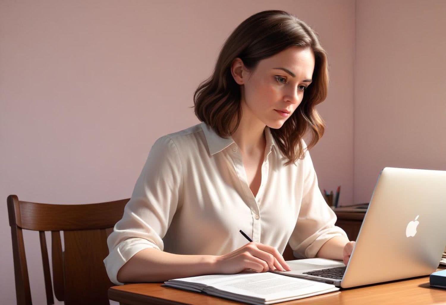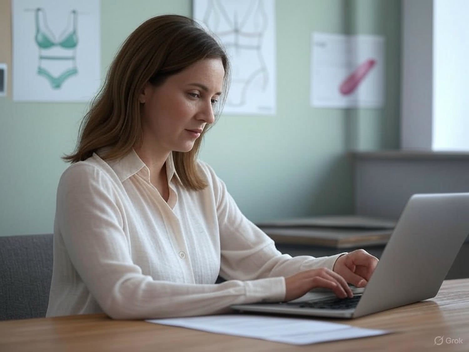 Semi-realistic illustration as a drawing: of a woman in her mid-30s with soft, shoulder-length brown hair, wearing a light-colored blouse, seated at a wooden desk. She is focused on reading an article on a laptop, which is positioned prominently in front of her. The background features subtly lit, pastel-colored walls with a few discreet, tasteful images of lingerie and a diagram of safe sex toy usage in the background. The room has a minimalist, professional decor with soft natural light filtering through a window to the side, creating a calm and educational atmosphere. The overall composition centers on the woman and her engagement with the educational content, maintaining a respectful and focused tone. IMAGE STYLE: Use a warm color palette of red, deep blue, deep purple, deep orange, light grays, and a touch of green, yellow. Draw outlines with black lines. The background should be blurred and minimalistic. The mood should be modern with a bit of vintage style.