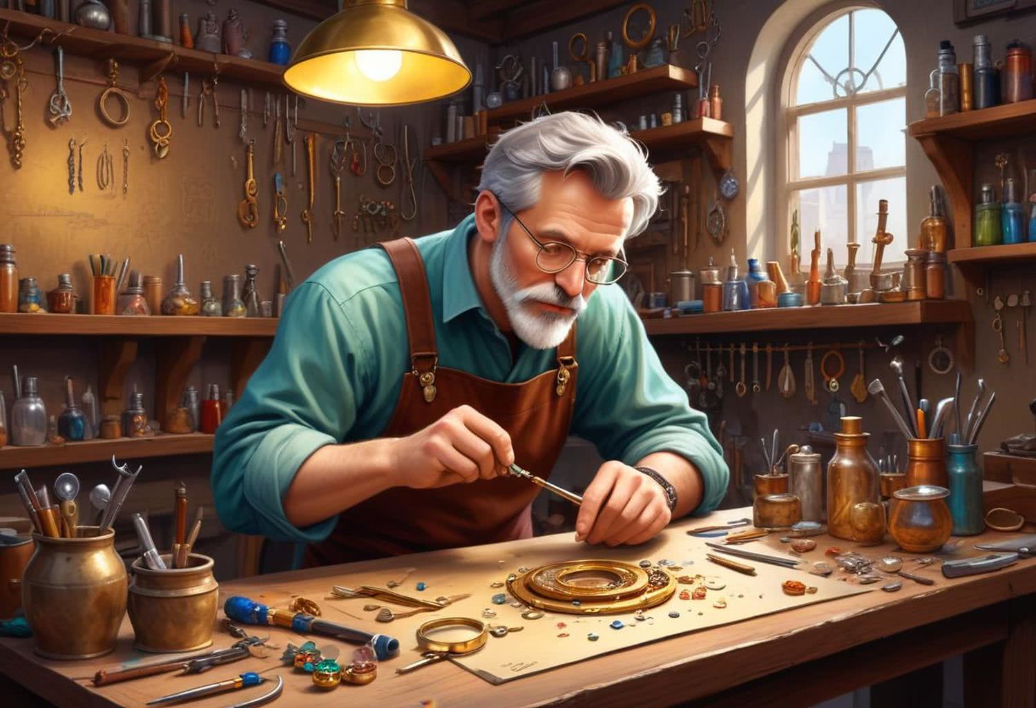 Semi-realistic illustration as a drawing: of a goldsmith in his well-lit workshop, set in a professional and colorful environment. The goldsmith, wearing a jeweler’s magnifying glass, is focused on crafting a piece of jewelry, with various gold items and tools scattered around him. In the background, a Google map with a pin marking „Kraków” is visible, along with subtle positive reviews indicated by stars and a search engine icon. The workshop features natural light from a window, enhancing the warm, inviting atmosphere without distracting from the main subject. The overall composition emphasizes the goldsmith and his work, subtly incorporating local SEO elements to highlight his local business presence in Kraków. IMAGE STYLE: Use a warm color palette of red, deep blue, deep purple, deep orange, light grays, and a touch of green, yellow. Draw outlines with black lines. The background should be blurred and minimalistic. The mood should be modern with a bit of vintage style.